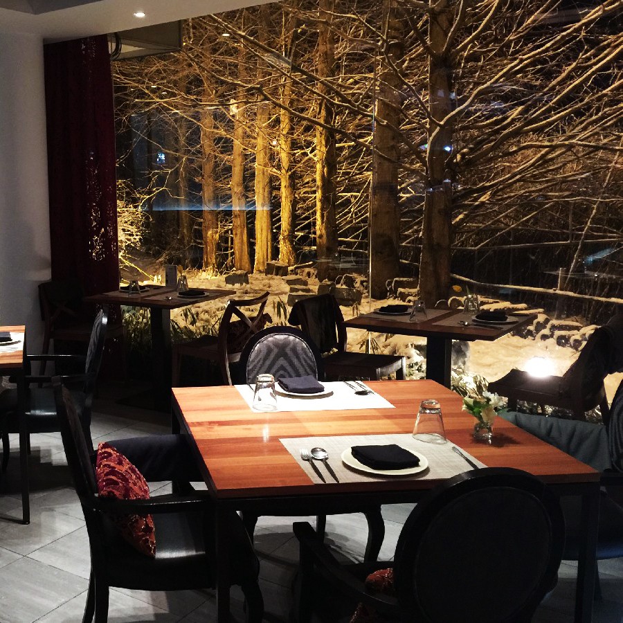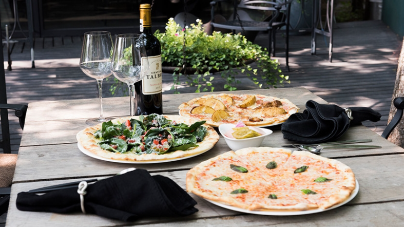 샐러드, 피자, 파스타, 스테이크 코스, 와인